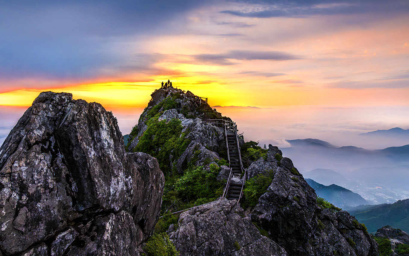 산山 일출을 즐기는 사람들