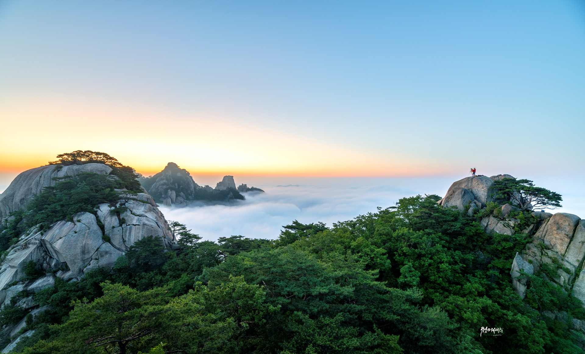 산山 아침을 즐기는 사람들
