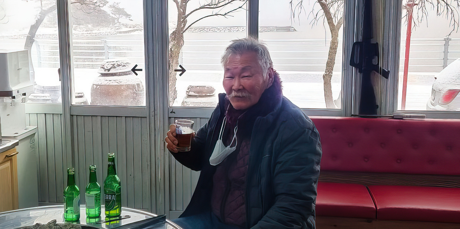 전화를 끊구 내허구 녹차밭길루 눈구덩이를 가구 있다가