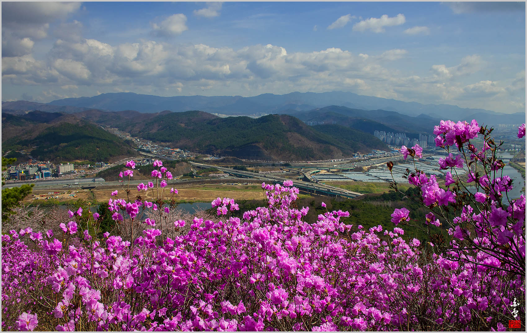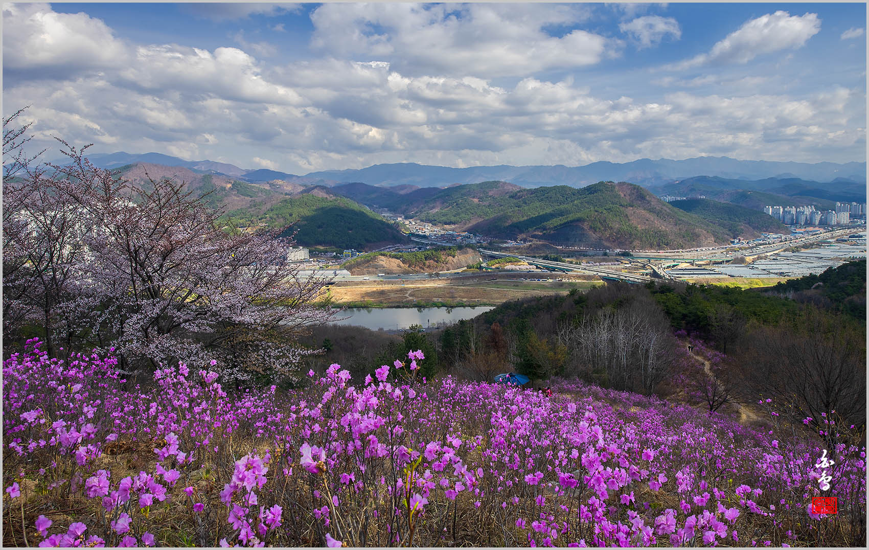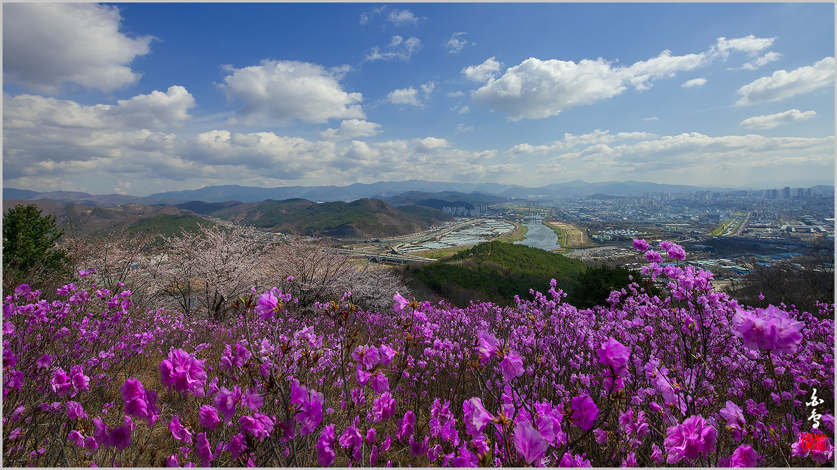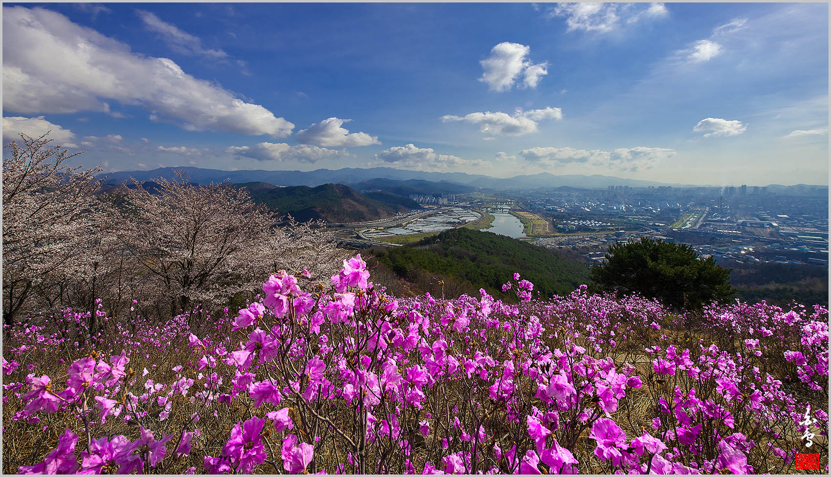 제 소견으로 진달래는 만개수준이며 산벚꽃은 50%정도인것 같아요