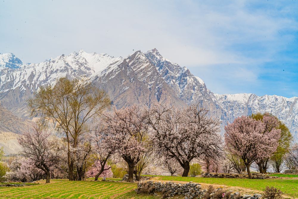 심혈을 기울여 담은 설산과 살구꽃
